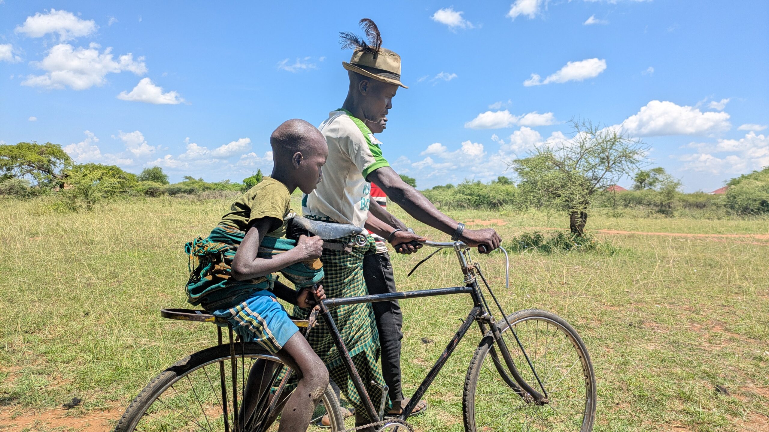 Achterop zat zijn 15-jarige zoon, zorgvuldig vastgebonden met een kleurrijke doek.